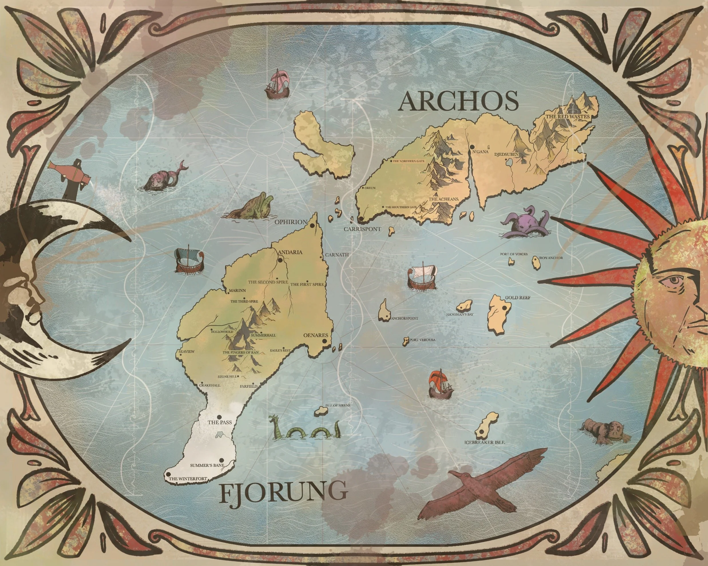 I’m very excited to reveal our first official map - showing the major settlements and islands of the continents of Fjorung and Archos!